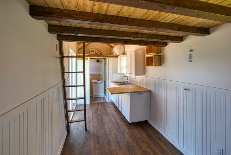 The Osprey is a 22’ home full of west coast flair. Locally stained fir trims, baseboards, and feature beams compliment a live edge slab of rough-edged wood countertop and hand-cut wavy cedar shingle features. A lot of love went into the flooring, which was salvaged from a barn that was over 100 years old and refinished into velvety flooring. The stairs were hand-made with a built-in cat box area. And yes - that is a horse trough tub, but no, we don’t recommend them for a comfortable or functional bathing experience! A drop-down deck makes setting up anywhere a breeze. This home was shipped partially unfinished on the inside for the clients to complete on their end.