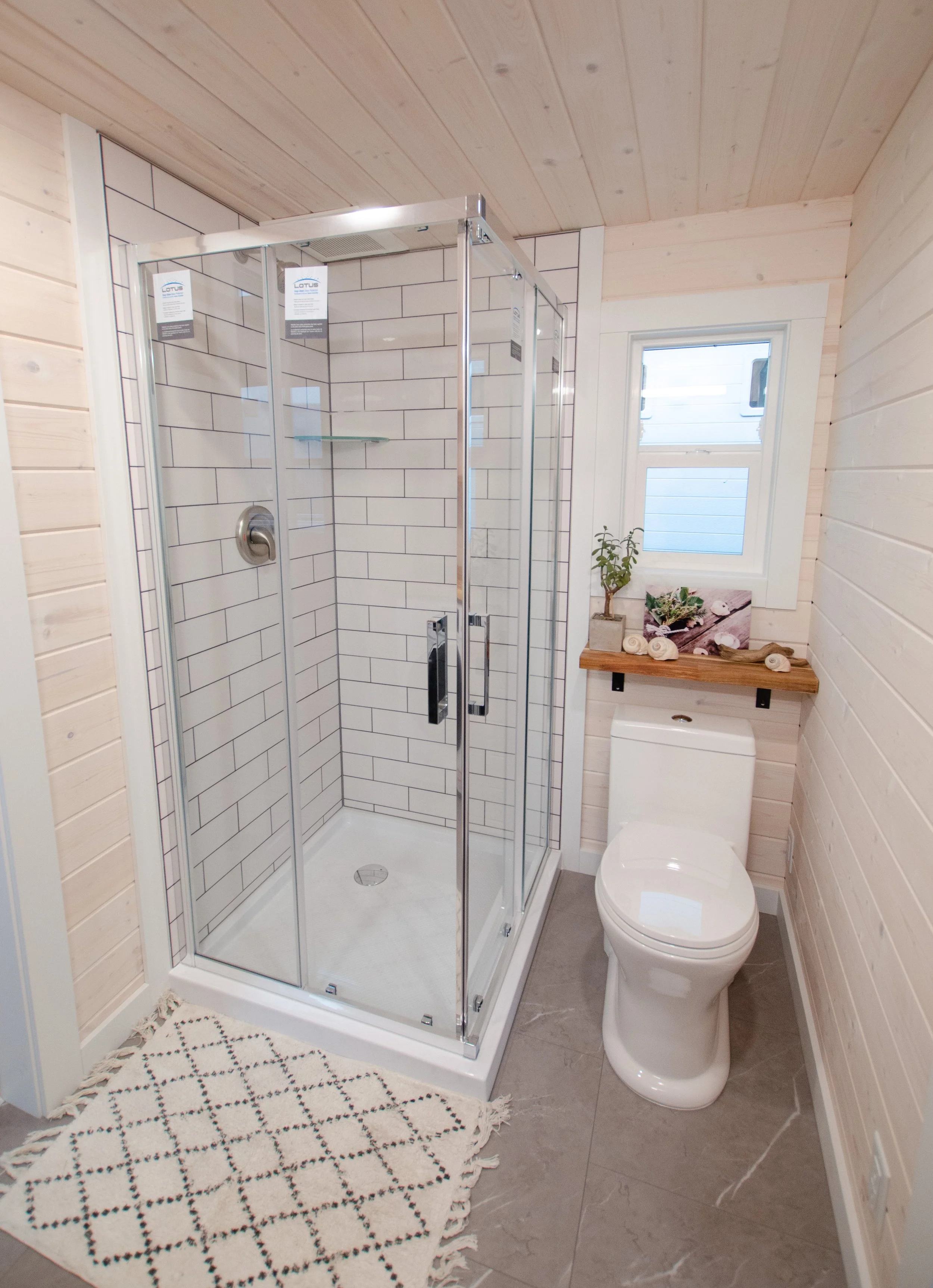 The bathroom is designed with both comfort and elegance in mind, featuring a custom tiled shower with a glass enclosure and a flush toilet with simple septic connection, making it suitable for long-term residential use.
