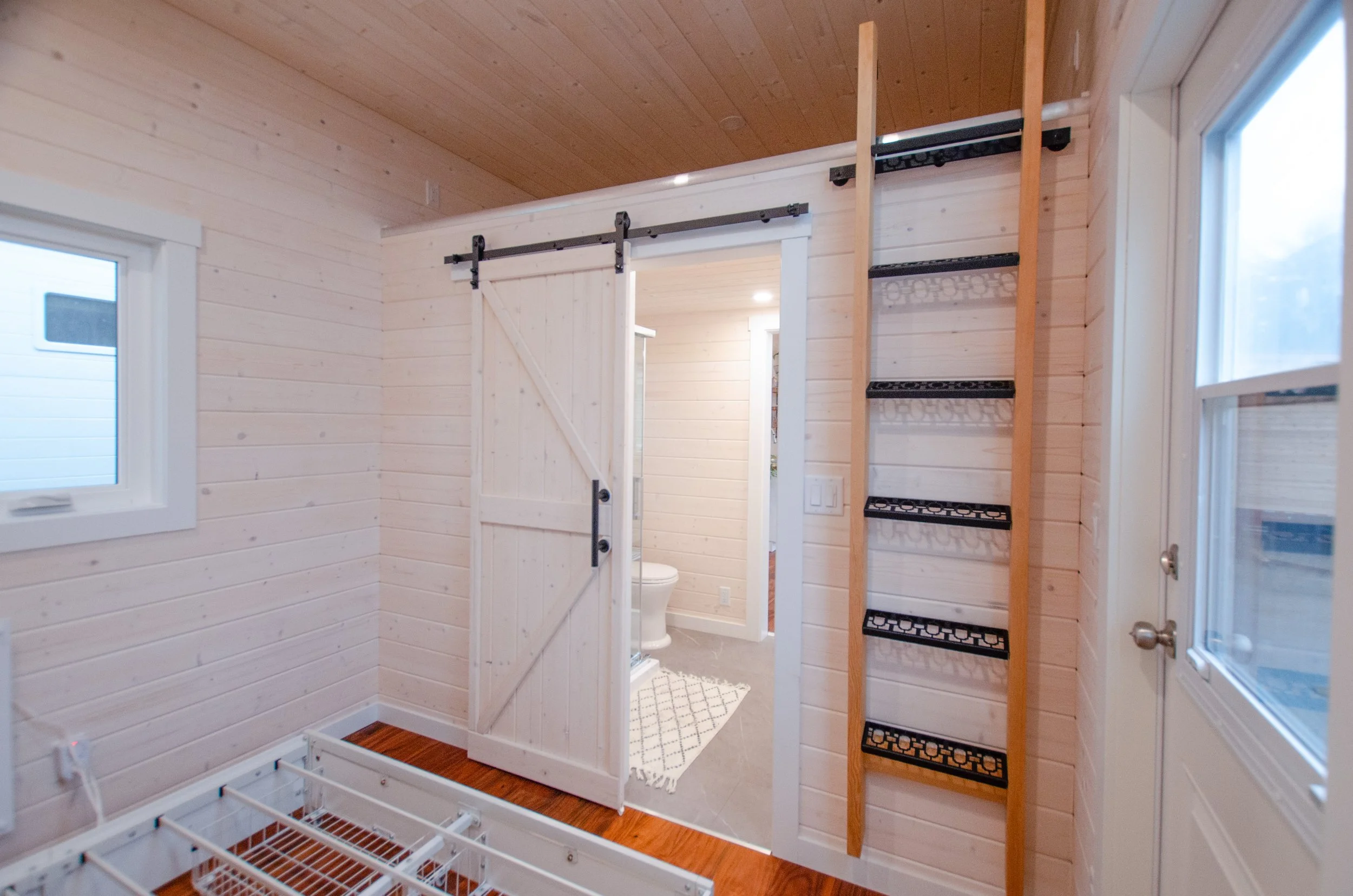 One of the standout features is the ground-floor bedroom, offering easy access and everyday comfort without the need to climb a ladder or stairs. The bedroom includes a private second entrance, convenient closet space, and storage beneath the bed, maximizing every inch of the design. Above, a storage loft provides additional space for seasonal items and belongings.