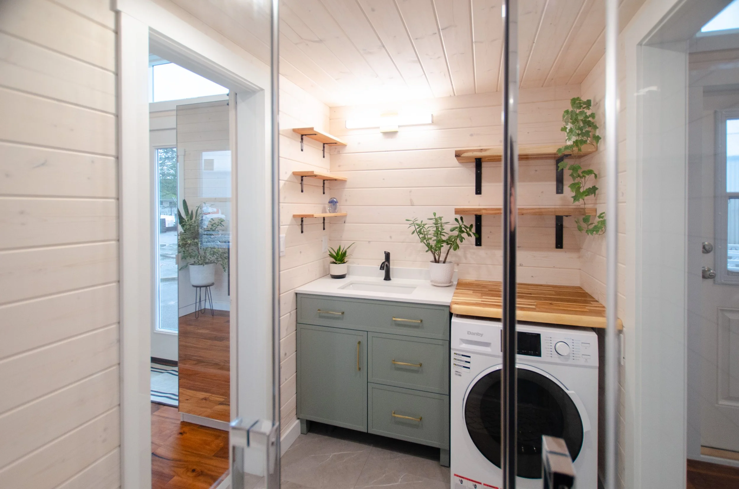 To simplify utility requirements, the home uses propane for both water heating and cooking, allowing it to run efficiently on just a 50-amp electrical connection.