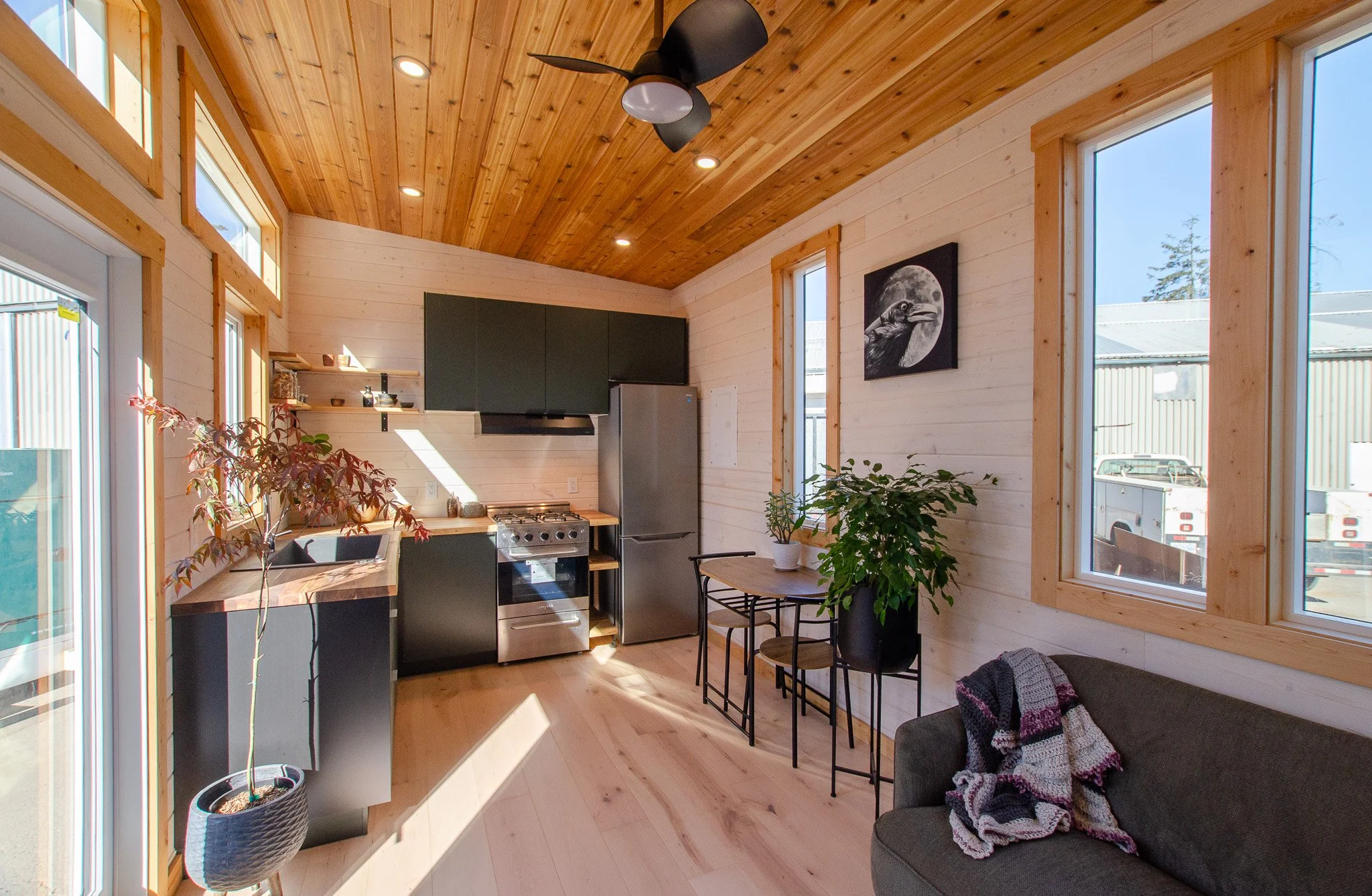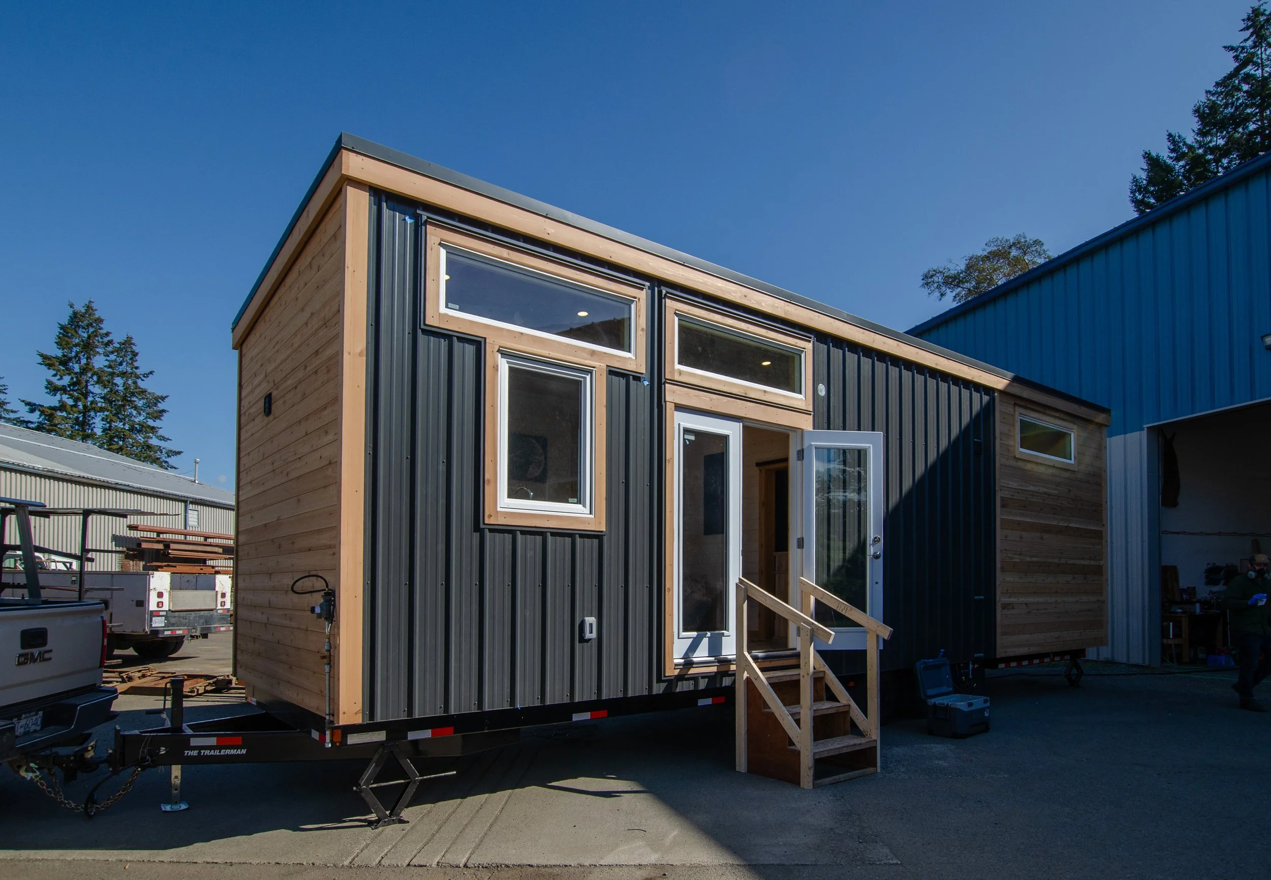 Step into this beautifully crafted 34' x 10'6" custom tiny home that blends comfort and elegance with West Coast charm. Featuring a classic and durable cedar and metal exterior, the home welcomes you with French doors and an abundance of natural light pouring through ample windows. Inside, the bright and airy interior is finished with a warm cedar ceiling and locally sourced fir wood trim, creating a cozy yet open feel.